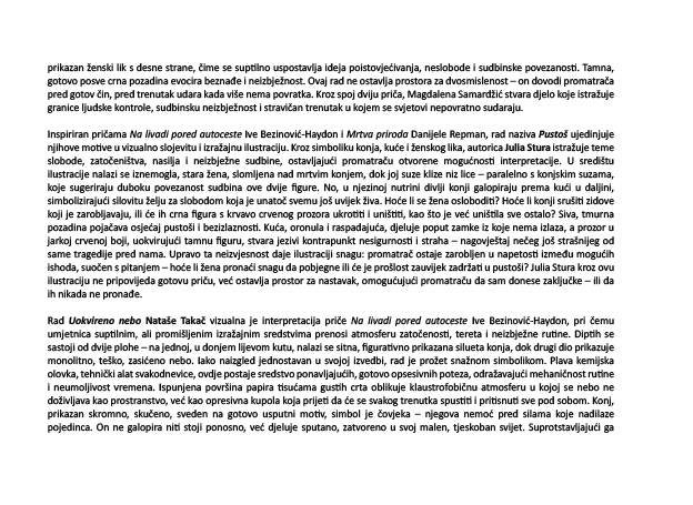 Izložba predstavlja zbir likovnih radova u formi ilustracije, nastalih različitim tehnikama i stilovima, koje prenose snažnu emocionalnu dubinu priče koja im je bila polazište. Odabrani/e umjetnici/e, predstavljeni/e na izložbi, dolaze s područja cijele Hrvatske i izražavaju se širokim spektrom likovnih jezika. Tehnike i stilovi zastupljeni u radovima su raznoliki i mnogobrojni, tako je često korištena kombinirana tehnika, ali i digitalna obrada, zatim akrilik na platnu i papiru, akvarel, olovka, tipografski štambilj, crtež na papiru, kolaž, ulje na platnu, monotipija, kemijska olovka na papiru, flomaster, digitalni print, ugljen, tempere i drvene bojice na papiru. Nekoliko radova je izvedeno u formi diptiha, triptiha ili poliptiha u svrhu što boljeg ilustriranja odabrane teme.