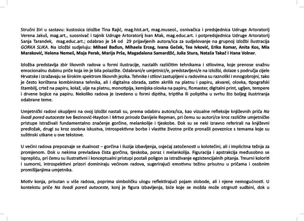 Umjetnički radovi okupljeni na ovoj izložbi nastali su, prema odabiru autora/ica, kao vizualne refleksije književnih priča Na livadi pored autoceste Ive Bezinović-Haydon i Mrtva priroda Danijele Repman, pri čemu su autori/ce kroz različite umjetničke pristupe istraživali fundamentalno značenje gorčine, melankolije i tjeskobe. Dok su se neki izravno referirali na književni predložak, drugi su kroz osobna iskustva, introspektivne borbe i vlastite životne priče pronašli poveznice s temama koje su suštinski utkane u ove tekstove.