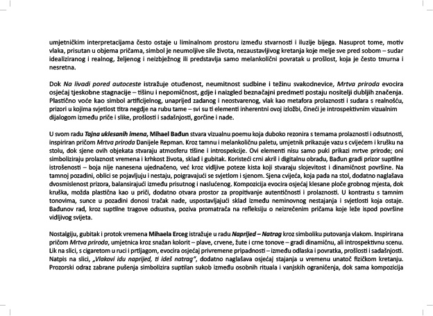 Umjetnički radovi okupljeni na ovoj izložbi nastali su, prema odabiru autora/ica, kao vizualne refleksije književnih priča Na livadi pored autoceste Ive Bezinović-Haydon i Mrtva priroda Danijele Repman, pri čemu su autori/ce kroz različite umjetničke pristupe istraživali fundamentalno značenje gorčine, melankolije i tjeskobe. Dok su se neki izravno referirali na književni predložak, drugi su kroz osobna iskustva, introspektivne borbe i vlastite životne priče pronašli poveznice s temama koje su suštinski utkane u ove tekstove.