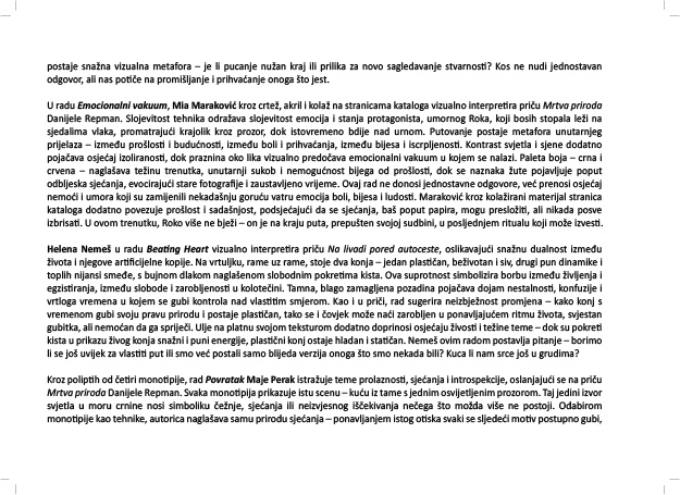 Umjetnički radovi okupljeni na ovoj izložbi nastali su, prema odabiru autora/ica, kao vizualne refleksije književnih priča Na livadi pored autoceste Ive Bezinović-Haydon i Mrtva priroda Danijele Repman, pri čemu su autori/ce kroz različite umjetničke pristupe istraživali fundamentalno značenje gorčine, melankolije i tjeskobe. Dok su se neki izravno referirali na književni predložak, drugi su kroz osobna iskustva, introspektivne borbe i vlastite životne priče pronašli poveznice s temama koje su suštinski utkane u ove tekstove.